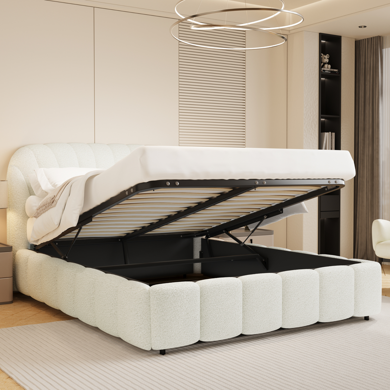 This luxurious ottoman storage bed features an elegant and contemporary design, perfect for adding a touch of sophistication to any bedroom. The bed is upholstered in a soft, white boucle fabric that offers a cozy and textured feel, enhancing the overall comfort and style. Its distinctive headboard showcases a gently curved, scalloped pattern that adds an element of charm and refinement.