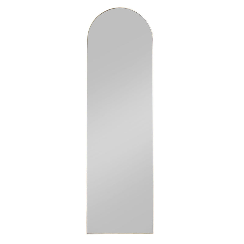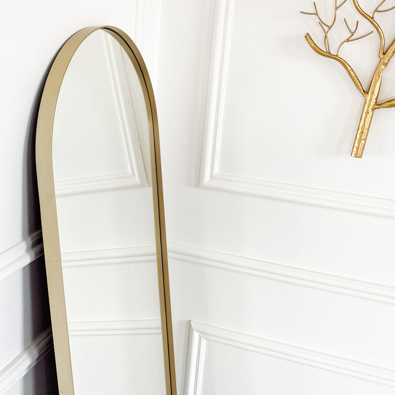 This champagne arched leaner mirror will add glamour and style to a variety of spaces. Perfect for the illusion of space, this full-length, floor standing piece features and on trend, curved design and striking minimalistic metal frame.