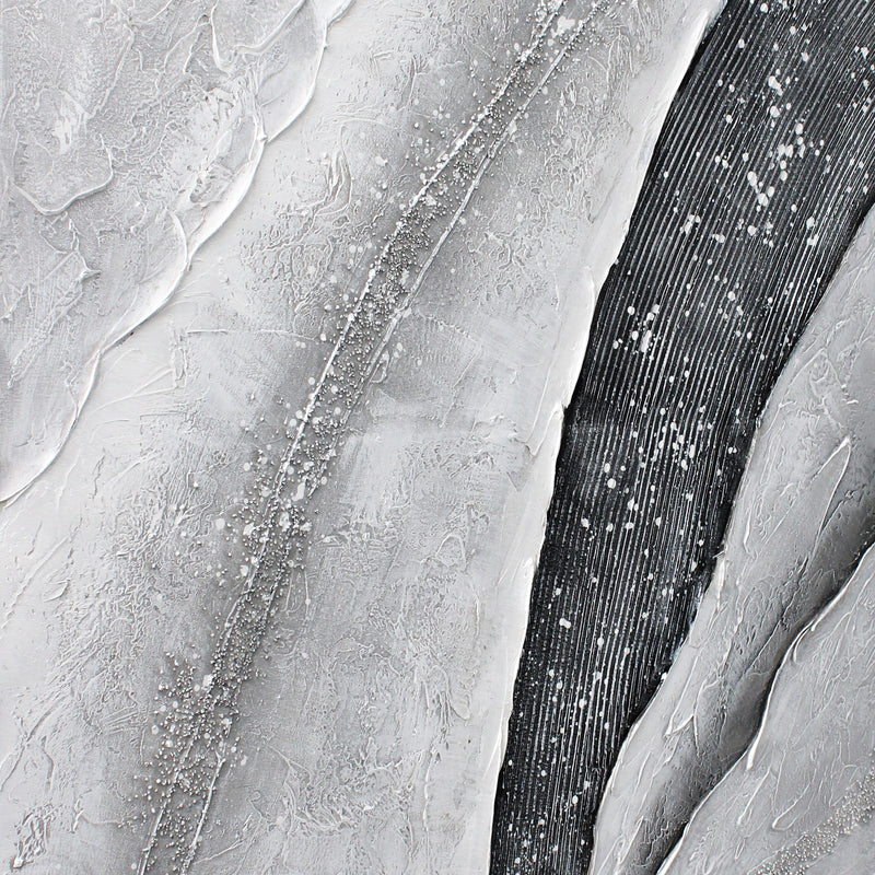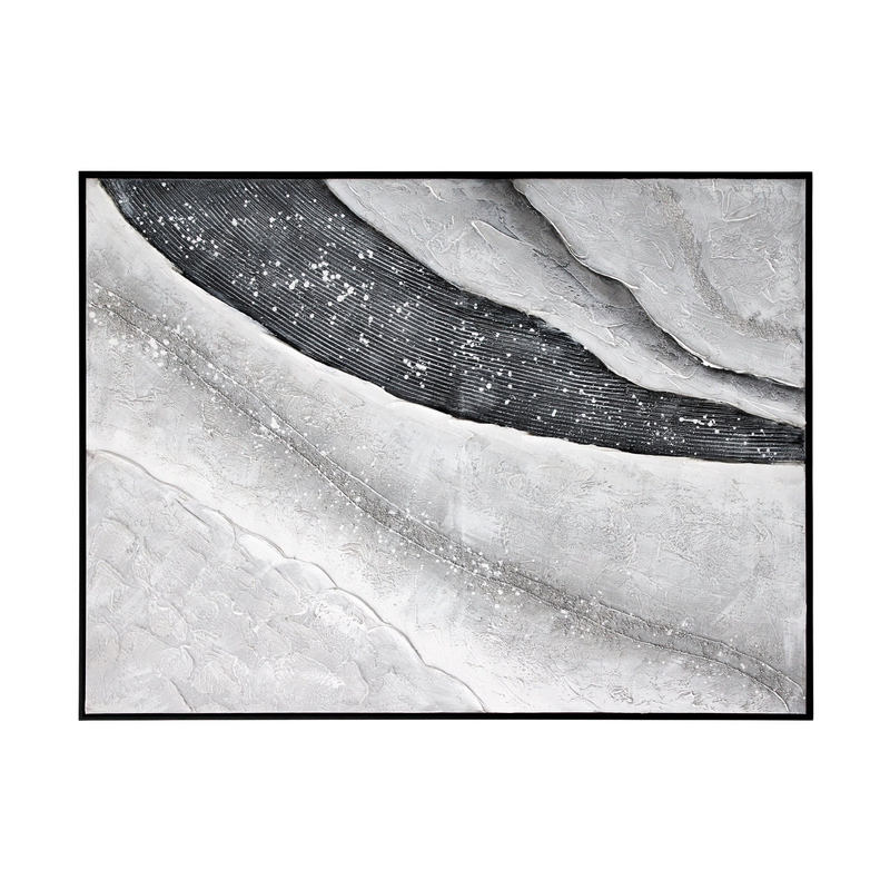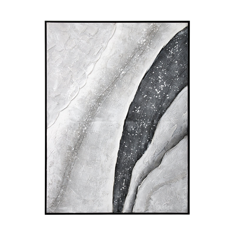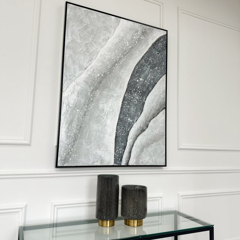 This canvas depicts an abstract image influenced by forms of nature. Tones of stylish grey run in rivers over the surface, suggesting movement, texture and shadow. A darker grey area pulls the eye inwards and creates depth. A visually striking abstract piece which will bring an artistic statement to your walls, Position anywhere in your home to add movement and texture.