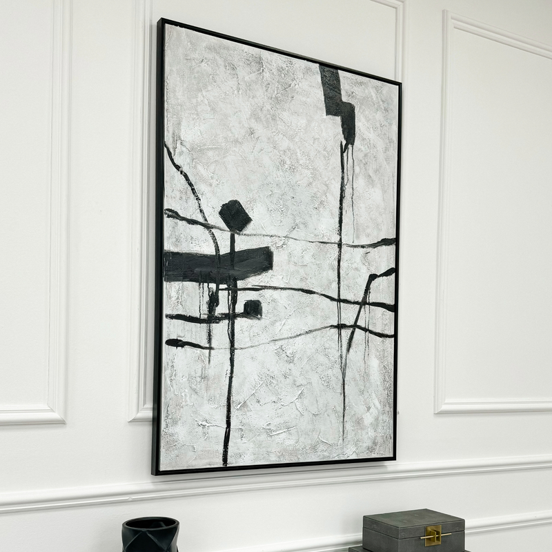 This abstract artwork will bring a sense of simplicity to your interior. A texturally painted background in tonal grey and white, is overlaid with a loose composition in opaque black. Perfect for creating that gallery feel in your own space. Each canvas is finished with a sleek stylish black frame.