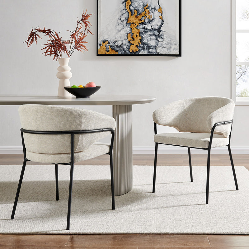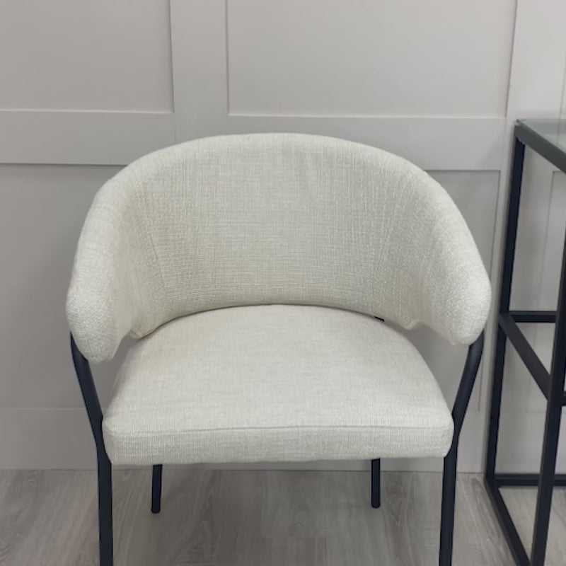 This contemporary chair with its elegant lines and sleek back metal frame would be a stylish addition to any dining table. Upholstered in a light cream woven linen effect fabric, this plain weave with soft brushed tufting lends subtle tactility, and compliments the curved back and armrest. A thick upholstered seat pad finishes the look. This would also make a stylish choice for a dressing table or accent chair.