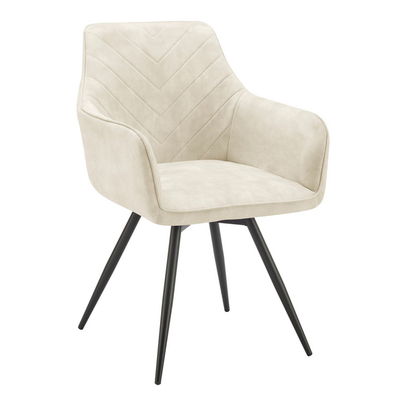 This classic contemporary luxury swivel dining chair upholstered in sumptuous cream velvet offers a modern approach to stylish seating. A foam filled chair with wing armrests is enhanced further by a chevron stitch detail to the chair back. The base incorporates a 180 degree swivel mechanism with return function - great for sociable dining. A perfect chic addition to a dining area, sit in comfort and entertain guests with the comfort of these stylish chairs. Finished with a powder coated leg in contrasting black, to add a timeless classic look.