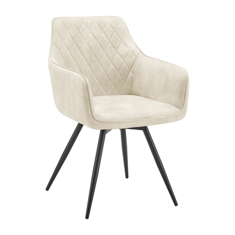 This classic contemporary swivel luxury dining chair upholstered in sumptuous cream velvet offers a modern approach to stylish seating. A foam filled chair with wing armrests is enhanced further by a diamond stitch detail to the chair back. The base incorporates a 180 degree swivel mechanism with return function - great for sociable dining. A perfect chic addition to a dining area, sit in comfort and entertain guests with the comfort of these stylish chairs. Powder coated sleek black tapered legs finish the look.