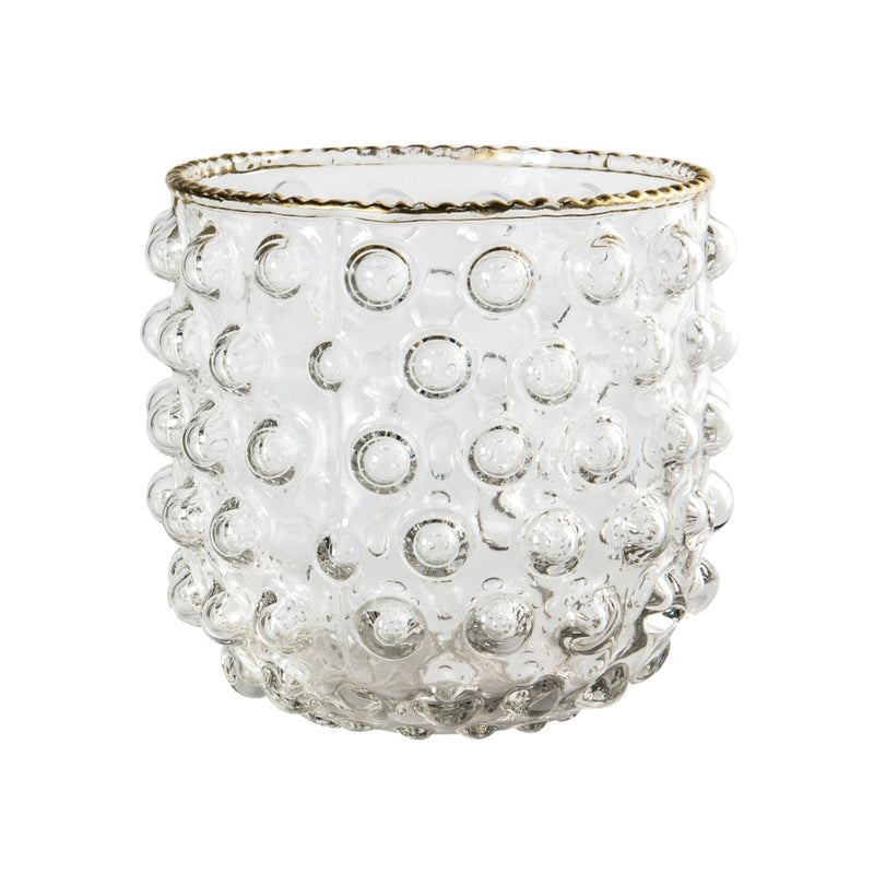 Create an invitingly golden glow with this gorgeous votive candle holder, we love this piece styled as a set of 3 for a cosy tablescape or styled with some small dried florals. Finished with a textured hobnail design which gives beautiful light dispersion, this tealight holder is a pretty piece to update your space. .