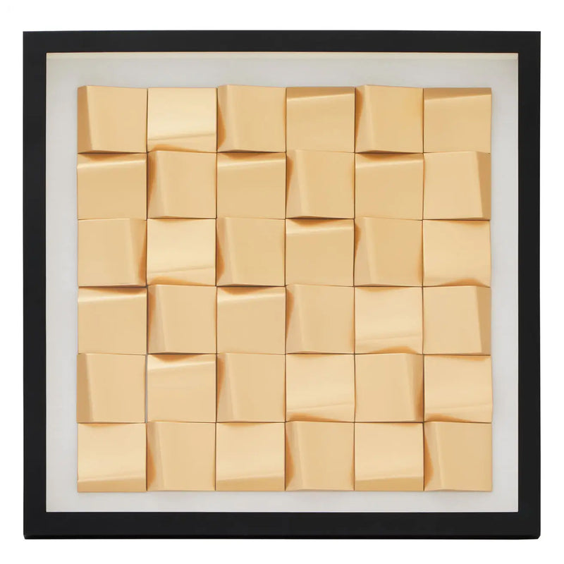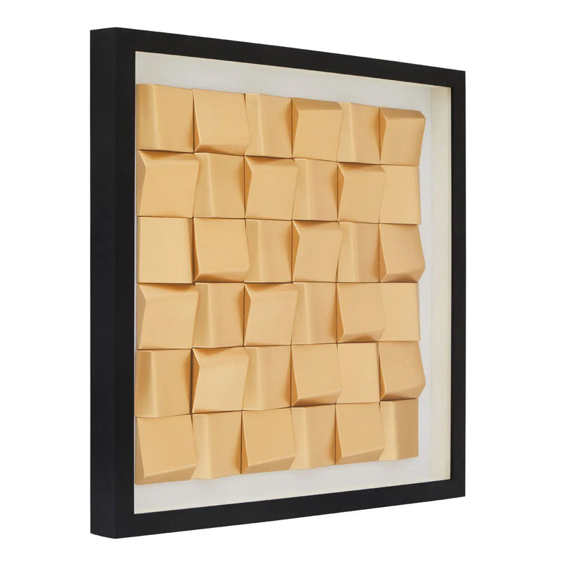 This striking artwork showcases geometric gold blocks arranged at contrasting angles to create a unique three dimensional piece. Finished in a gold painted lustre, the blocks are backed by a neutral linen which sits securely behind glass and is housed within a black wooden frame.