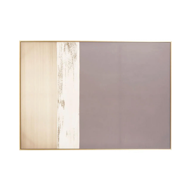 Combining calming tones of neutral beige and chalky grey with a dramatic brush stroke of metallic gold foil; this stunning art work creates a serene look making it perfect for bedrooms and living rooms. Sitting within a thin wooden frame, this large minimal canvas will create a soft statement for your home.