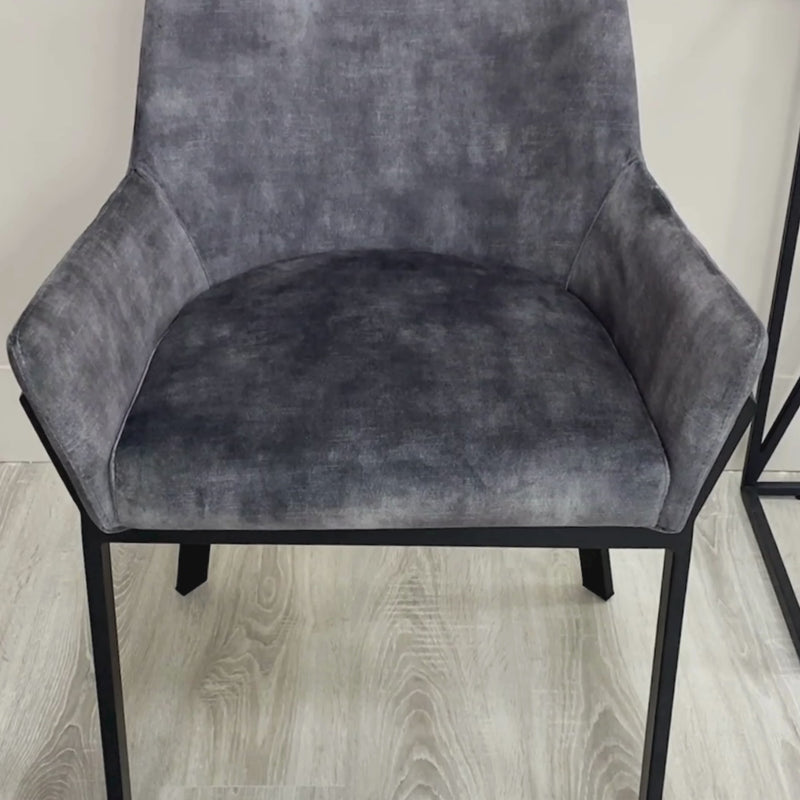 This contemporary chair showcases angular winged armrests with a bold, geometric design. Upholstered in a soft grey velvet with black powder coated frame and legs. This would also be a statement dining chair for a variety of table styles.