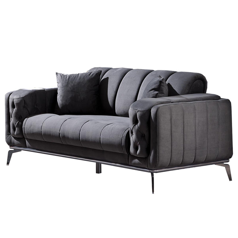 With a modern design and comfy, padded support, the Holly chunky ribbed sofa in grey velvet comes as a 2 seater or 3 seater sofa. Featuring contemporary polished silver detail and minimal silver legs, this gorgeous sofa makes a stunning centre-piece to chic living rooms and comes in a soft and neutral rich grey tone with button embellished arms and back. Offering firm support, the Holly structured sofa features a rotating back rest allowing this to become an extra large lounger for a cinema room feel.