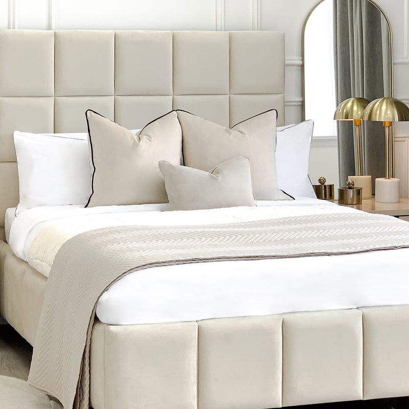 The Imogen bed with its bold square panelling headboard and base detail will be a high-end statement for any bedroom. A soft touch Cream velvet fabric to the on-trend high headboard gives a cosy, luxe feel. Elevated on gold polished feet, Imogen stands off the floor, to give a light open contemporary appeal to the bedroom. Cleverly, Imogen has ottoman storage while still maintaining an open base look. Available in two sizes, Double or King, Imogen brings presence and elegance to any bedroom space.