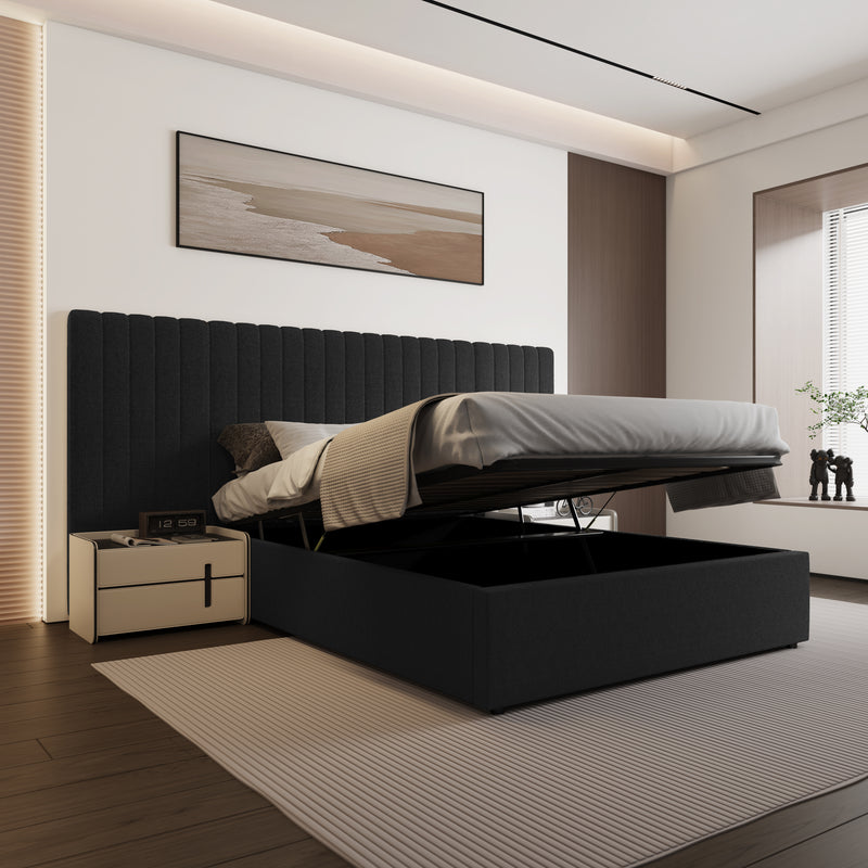 In addition to its impressive visual appeal, this bed frame offers exceptional practicality with its front-lift ottoman storage. The easy-lift mechanism reveals a spacious storage compartment, perfect for stowing away bedding, linens, or other essentials, helping you maintain a clutter-free sanctuary.