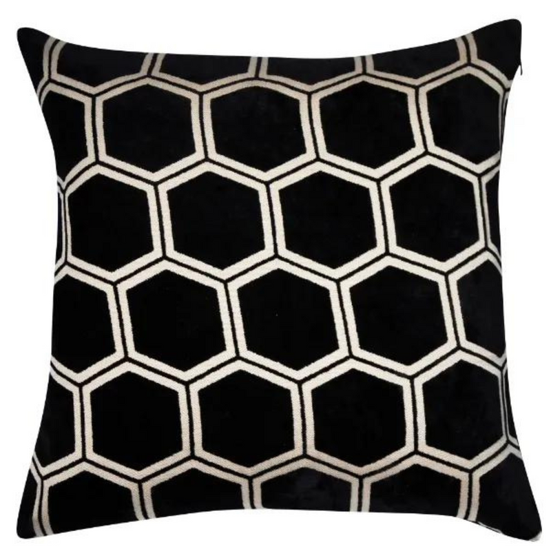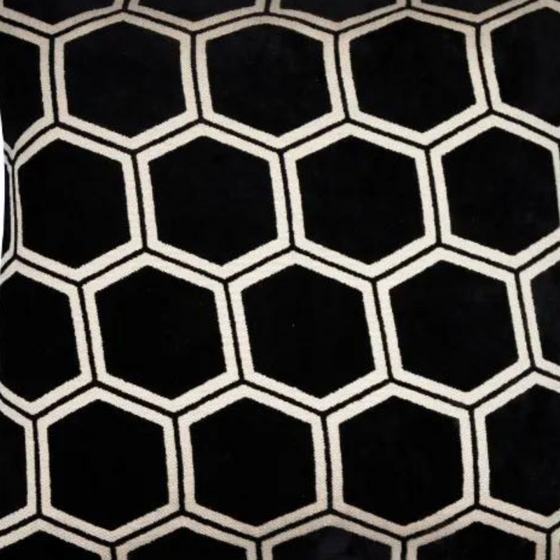 In a sumptuous velvet, the Ivor cushion in jet black will elevate the look of your chair and sofa. A contrasting large honeycomb pattern in off-white adorns the surface. Place by itself, or layer with others for maximum softness.