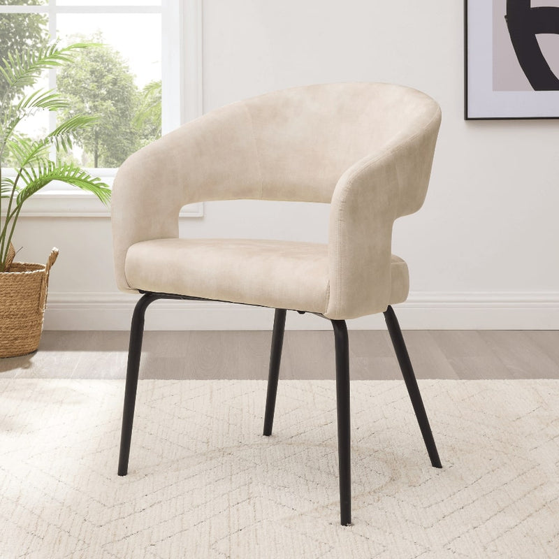 Crafted with a smooth curved silhouette and supported by slender black metal legs, this chair blends contemporary minimalism with boutique-style comfort. Whether you're styling a modern dining room, elegant breakfast nook, or home office, the Jasmine Chair delivers plush seating and refined aesthetic appeal.