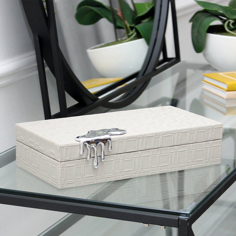 Add a luxe touch to any surface, this shallow decorative box with embossed cream faux leather is a perfect piece to store loose collectibles. Finished with a contrasting shiny chrome drip effect decoration to the edge, this box will add interest while still being useful.