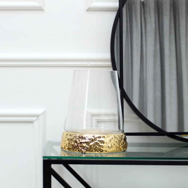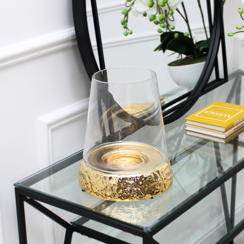 The rounded metal base of the Martele candle holder shows a beautifully handcrafted finish. The richly textured base is painted in a rich reflective gold, creating a series of waves and ripples, and a beautiful play with light. The shade is made from clear glass and has a gently tapered design.