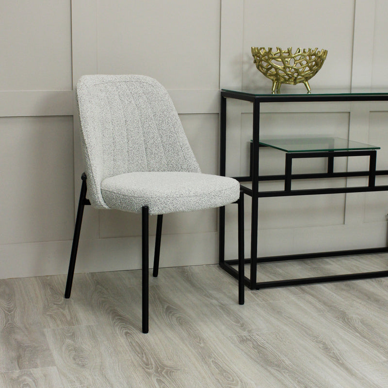 This elegant chair combines sleek contemporary Boucle with a minimal sleek metal black frame. Upholstered in a two tone fabric with lots of dimension, a warm grey background contrasts with curled fibres in a light cream to the surface. The result is a strong durable fabric, while still soft to touch, and brings a timeless expression. A slim upholstered seat pad finishes the look. This would also make a stylish choice for a dressing table or accent chair.