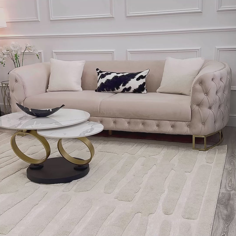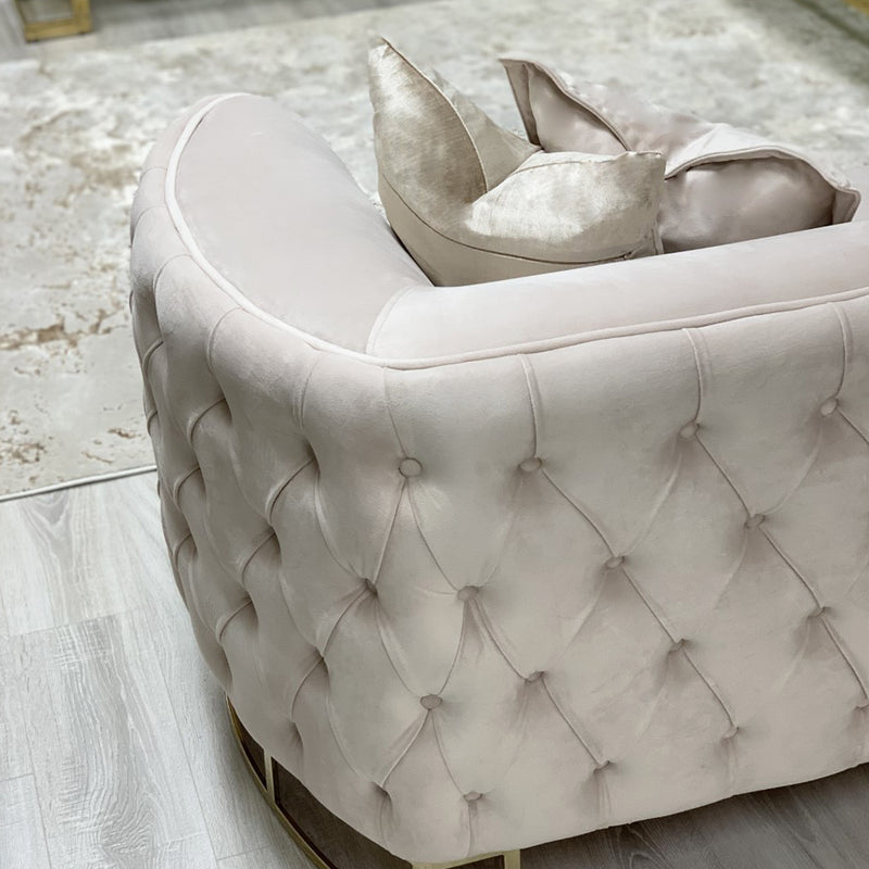 The Louise cream velvet sofa with gold legs comes as both a 3 and 2 Seater. With a modern take on the Chesterfield style, our buttoned sofa features a contemporary curved arm rest and geometric gold framed legs. Offering comfy support, perfect for lounging, the Louise is made using premium velvet upholstery with a super soft finish.