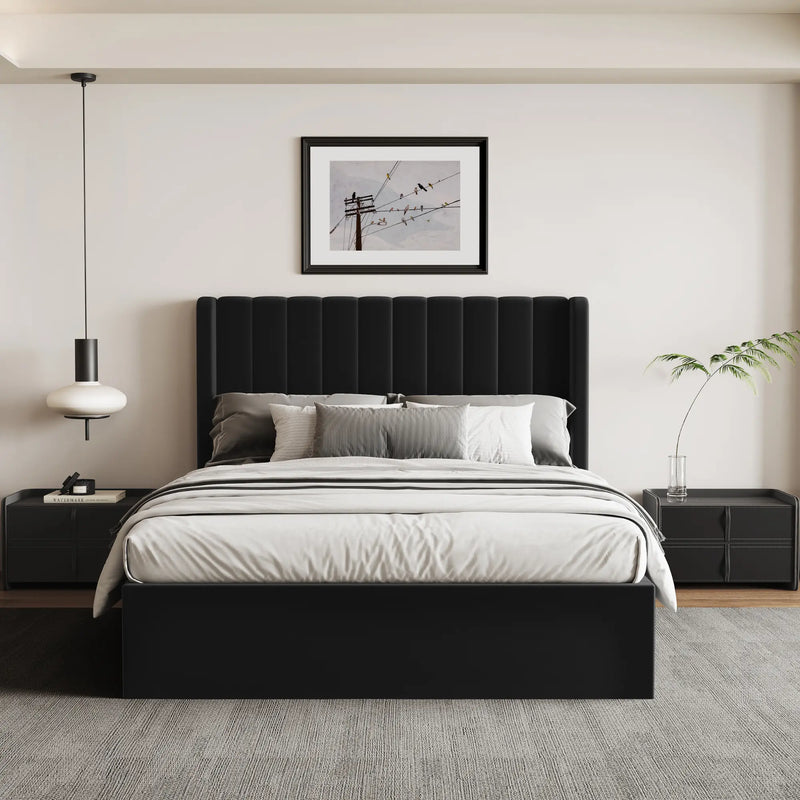 Bring elegance and practicality to your bedroom with the Maddison Black Velvet Ottoman Bed. Upholstered in rich black velvet fabric, this bed exudes a timeless charm while offering a soft and luxurious feel. The impressive 140cm tall, vertically panelled headboard adds a bold yet sophisticated touch, making it a stunning centrepiece for any modern space.;