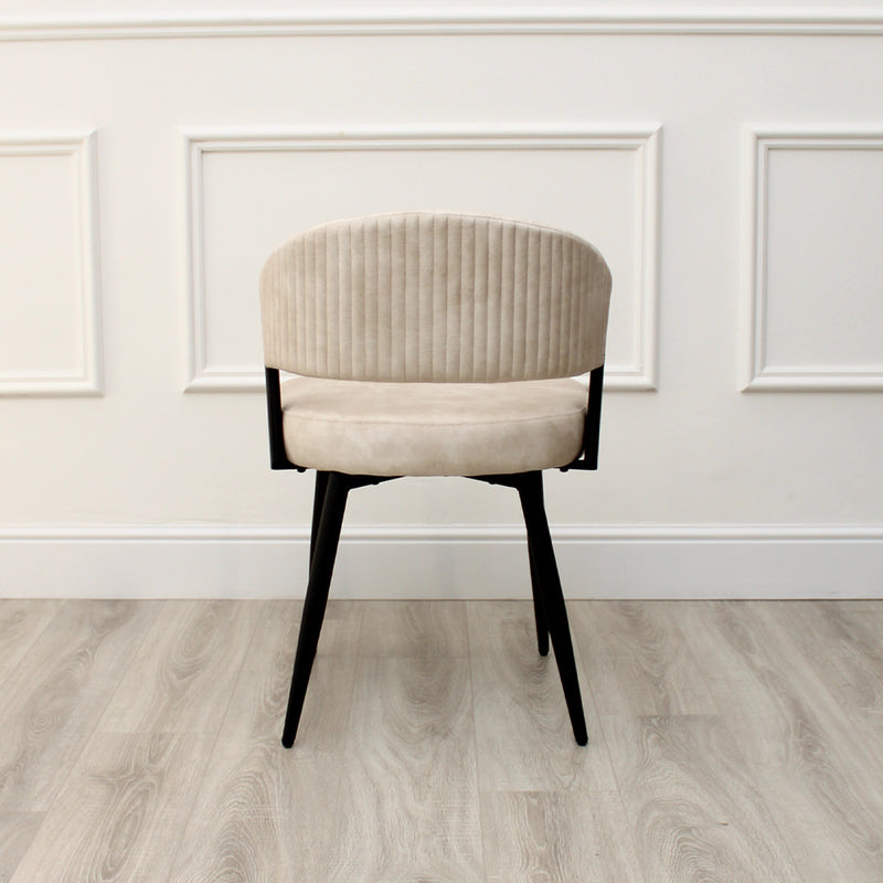 Elevate your dining experience with this sophisticated dining chair, designed to combine comfort and modern elegance. Upholstered in plush cream velvet, this chair features a beautifully curved backrest that not only enhances its ergonomic support but also creates a striking silhouette. The ribbed detailing on the backrest adds a layer of texture and refinement, making it a standout piece in any room.