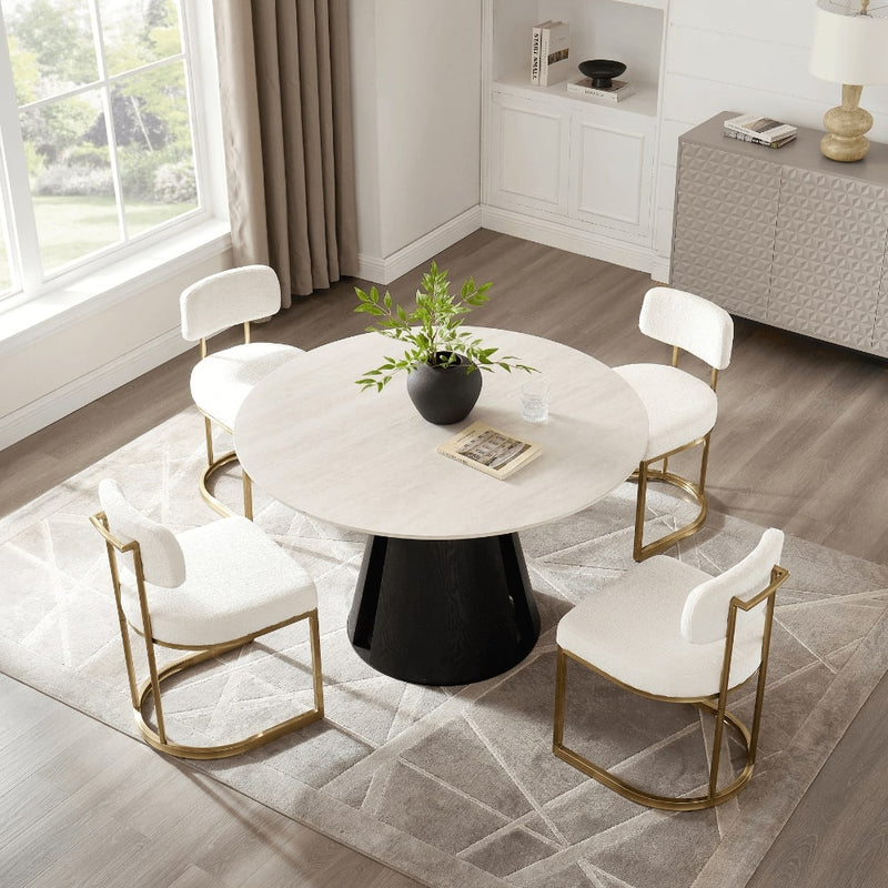 Transform your dining room with the exquisite Maya Round Ceramic Dining Table paired with four brushed gold Rhea Dining Chairs. This dining set is the perfect balance of modern aesthetics and functionality, combining premium materials, sophisticated design, and enduring comfort. Crafted to be a stunning focal point in your home, this set is designed to cater to both intimate dinners and larger gatherings, offering a sense of luxury and practicality.