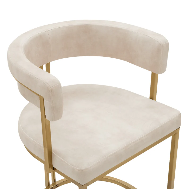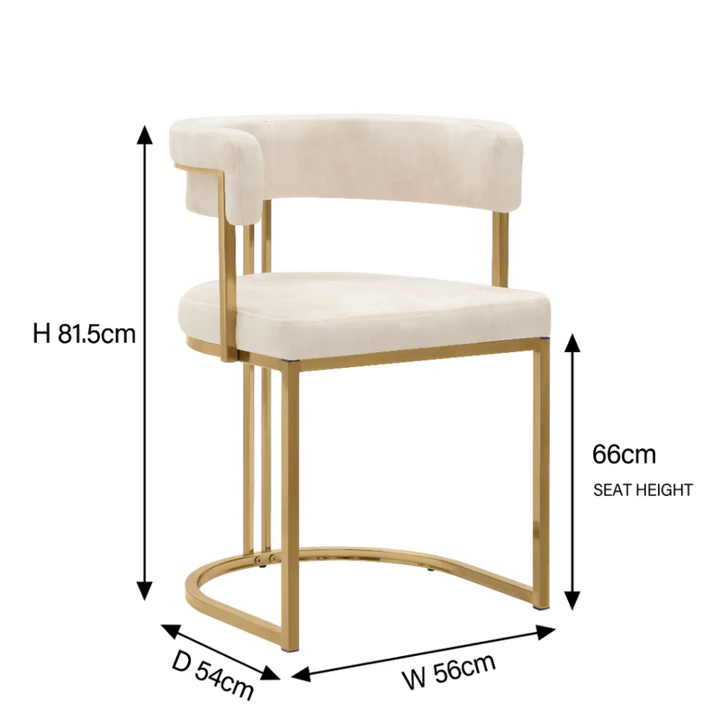 Elevate your dining space with the Mia Curved Cream Velvet and Brushed Gold Frame Dining Chair, designed to blend contemporary style with luxurious comfort. Upholstered in soft cream velvet, it offers a plush, inviting seat and a gently curved backrest for added support. The sleek brushed gold metal frame brings a refined, statement finish while delivering lasting durability, and the unique semi-circular base adds architectural flair. Perfect as part of a dining set or as a standout accent chair, it complements modern, contemporary, and minimalist interiors beautifully.