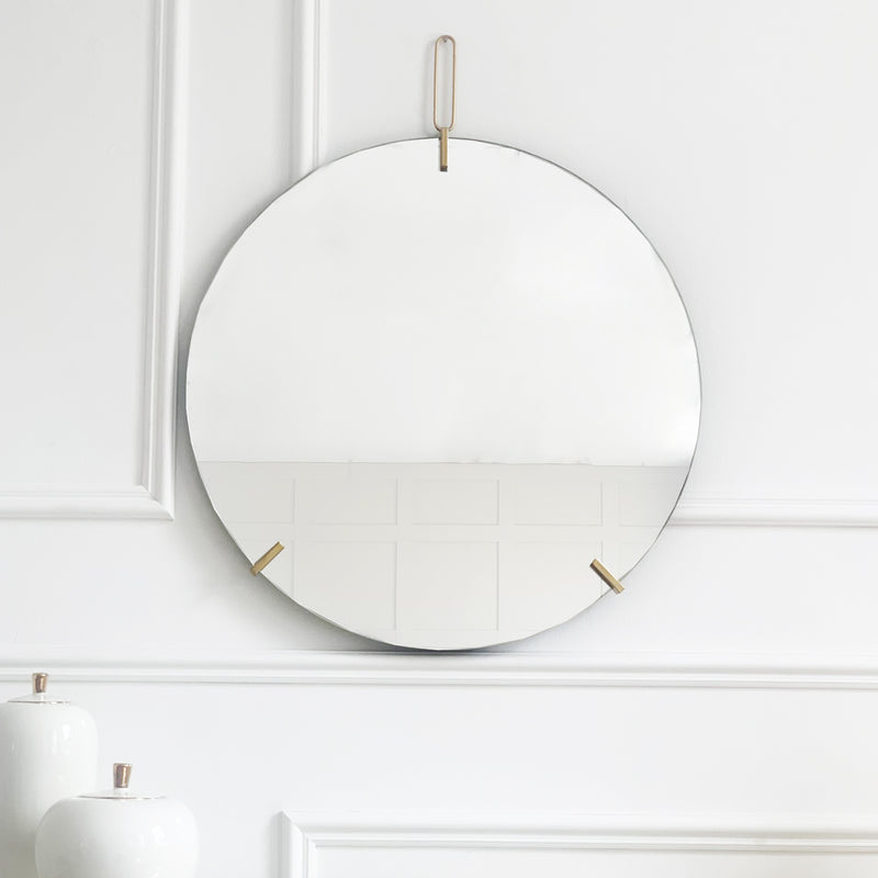 This modern and minimalist mirror has circular reflective glass finished with gold, metal hardware. The simple design make this a versatile piece which will compliment a variety of interiors.