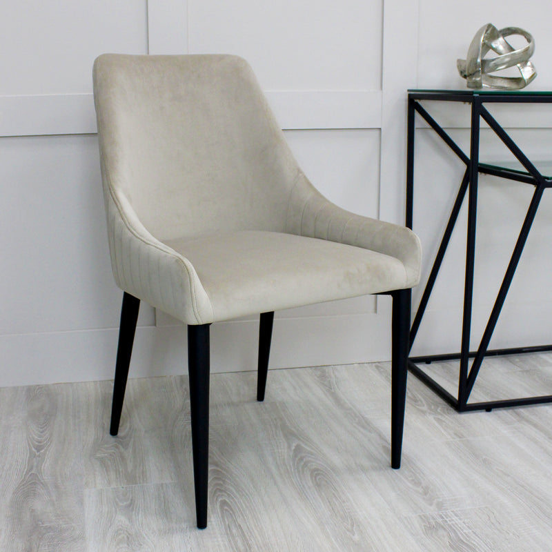 This classic dining chair has a timeless feel and features sturdy, modern matte black metal legs with stylish warm beige velvet upholstery. Design details include, low side rests with channel stitching which matches the linear stitch-work on the back of the seat. Made with comfort in mind, the supportive seat padding and curved backrest make this an ideal choice for modern dining.