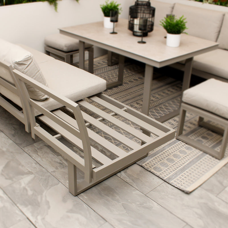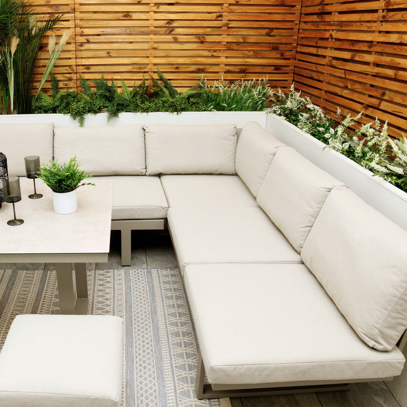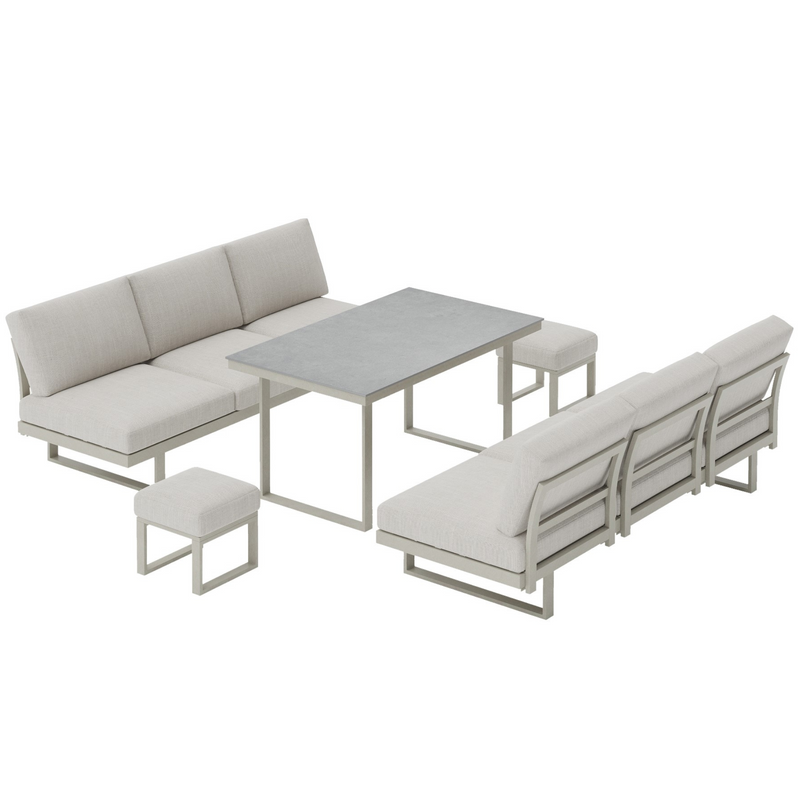 Introducing our contemporary Neutral Light Grey Aluminium Frame Modular Garden Set – a perfect blend of style, functionality, and durability for your outdoor space. Constructed from a water and weather resistant powder coated frame this set offers flexibility of use. The modular nature can be assembled as a dining set to entertain guests, then transformed afterwards into a corner sofa for outdoor relaxing. This set also can turn into 2 generously sized reclining loungers - ideal for sunny afternoons. Complete with washable cushions this set is practical while remaining super stylish.
