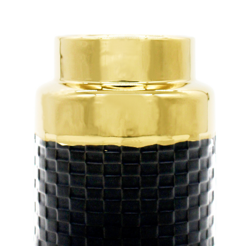 This vase will elevate any surface. Made from stoneware, its subtly raised embossed pattern to the base is finished with a matt black glaze. A contrasting shiny gold top collared section completes the look. Perfect as it is, or accessorize with some stems. This vase can also be grouped with others to create a strong stylish focal point.