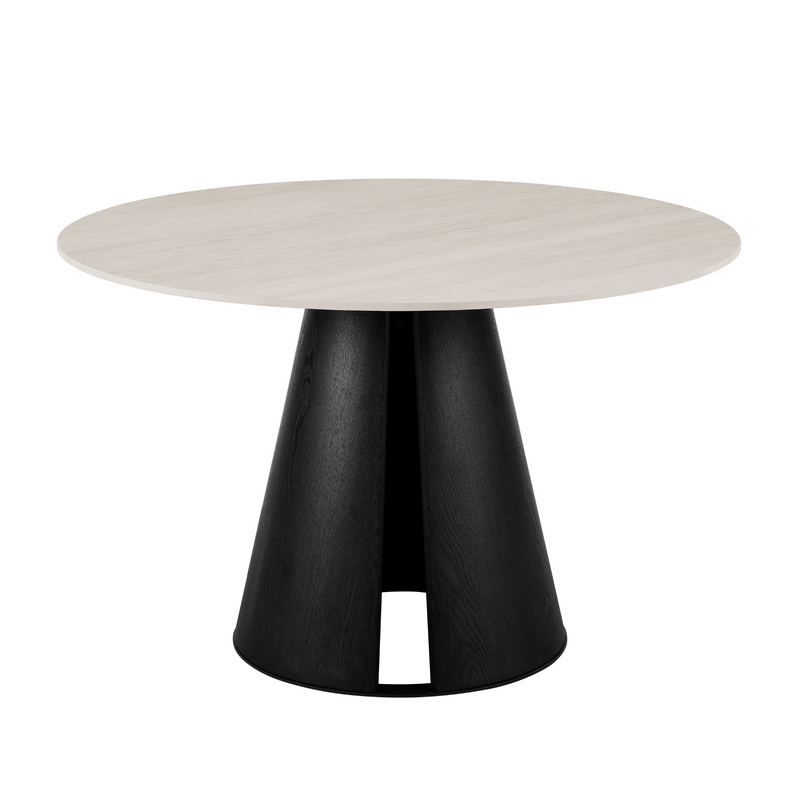 Ideal for intimate dining settings or as a chic breakfast table, this round design fosters connection and conversation. The combination of the ceramic stone top and the black wood veneer base creates a sophisticated contrast that seamlessly integrates into a variety of modern interior styles.