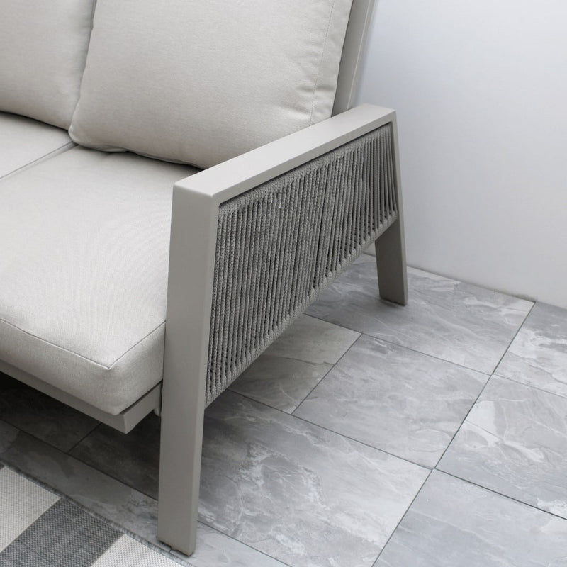 Each seating piece is adorned with plush beige cushions, offering a soft and inviting feel that complements the neutral tones of the frame. The armrests and backrests showcase a stylish rope-woven design, adding a contemporary touch and enhancing breathability for warm-weather comfort. Additionally, the plush beige cushion covers are designed with convenience in mind, they feature zippers, making them easily removable for hassle-free machine washing.