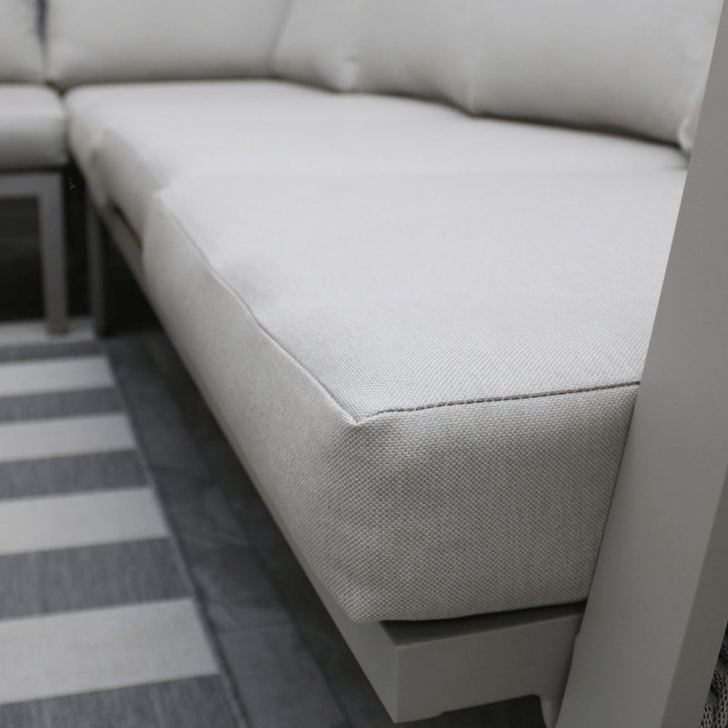 This elegant 6-seater garden corner sofa set features a sleek and durable aluminium frame, designed to withstand outdoor conditions while maintaining a modern aesthetic. The rust-free aluminium construction ensures long-lasting durability, making it a perfect choice for all-weather use.