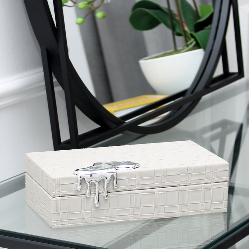 Add a luxe touch to any surface, this shallow decorative box with embossed cream faux leather is a perfect piece to store loose collectibles. Finished with a contrasting shiny chrome drip effect decoration to the edge, this box will add interest while still being useful.