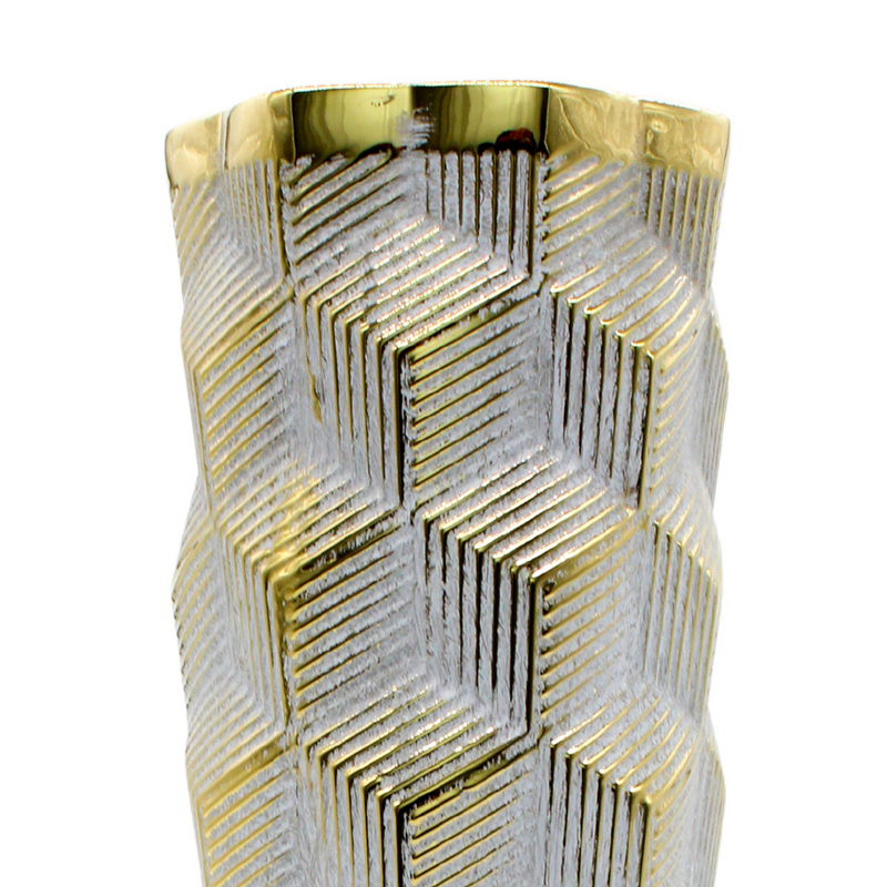 This small slim light grey vase with its geometric raised relief enhanced with contrasting gold painted lines will be a stylish addition to any surface. Perfect for bringing height to your home decor. Place on its own or pair with the smaller version for an impactful look. Also available in a larger size