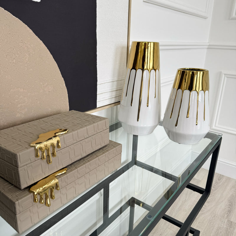 This stoneware vase in a modern tapered shape will add contemporary luxe to any home. Glazed all over in a high shine white, the top features a solid gold reflective section. Gold drips ornament the surface, cascading down, creating movement and texture. Perfect for placing on its own, or fill with stems. Also comes in a larger size.