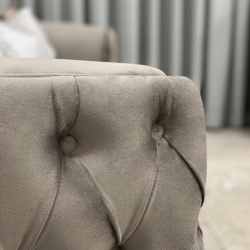 This stunning Mink Truffle Velvet Curved Sofa with Silver Legs comes as both a 2 seater and generous 3 seater. Made using a super soft, rich toned velvet, this premium sofa offers luxury aesthetic elements including a curved shape finished with a modern take on Chesterfield style buttons. We love the polished silver, metal legs with a contemporary geometric design. Giving plush and comfortable support, this luxe sofa comes with two pillows upholstered in the same truffle toned velvet.