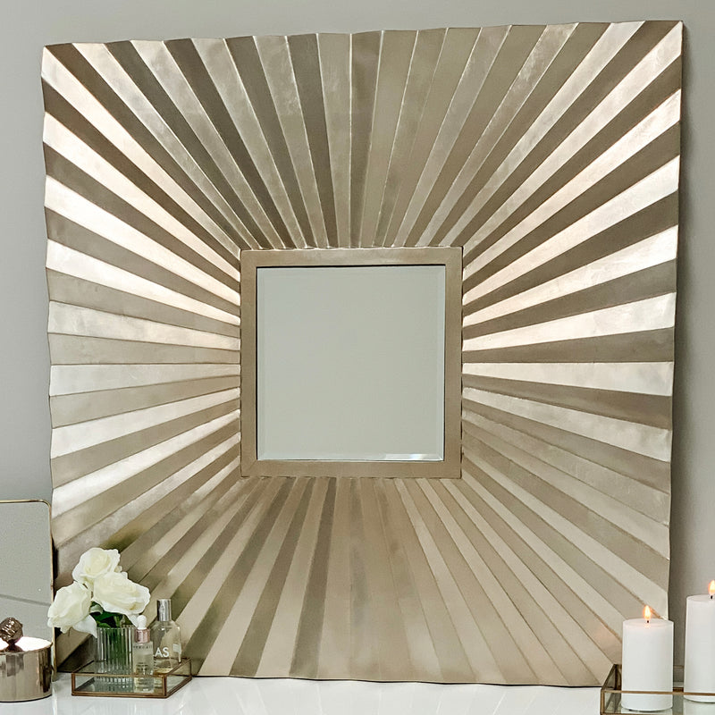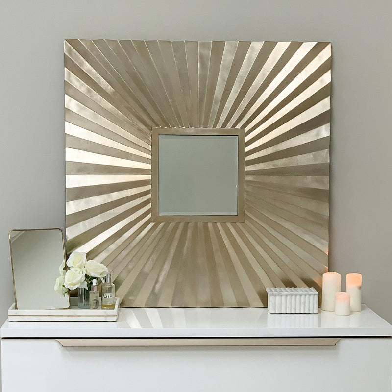 Our stunning Starburst mirror in champagne gold is a gorgeous accent piece, doubling as textured wall decor and a functional mirror. Suitable for wall mounting, this metallic statement mirror has a contemporary bevelled starburst design which works beautifully in modern homes.