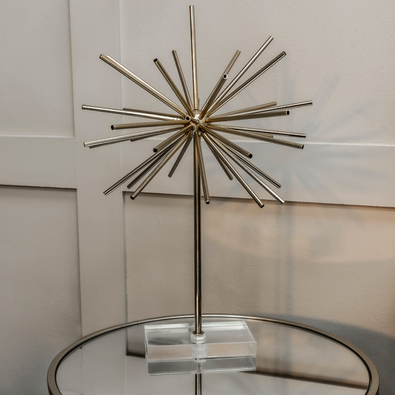 The minimal and modern Starburst statue in gold with clear acrylic stand makes a stunning addition to your home decor. Featuring a glamorous ‘starburst’ design in warm metallic gold, this piece works well on coffee tables as well as shelves for a luxe look.