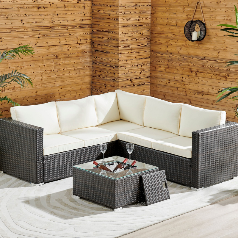 This stylish corner sofa set is comprised of one three seater and one two seater sofa (seating up to 5 people) and a coffee table (with 5mm tempered glass) that doubles as an ice bucket – perfect for any occasion that requires more than tea or coffee. You’ll have the luxury of relaxing in style whilst your drinks are kept cold in the built in ice bucket (perfect for entertaining guests during the warm summer evenings), or cover it over and use as a coffee table during the day! Guaranteed to make a statement in any outdoor living space thanks to its contemporary design, this luxe rattan set also features water-resistant, machine washable, bounce-back cushions so you can soak up the sun in comfort.