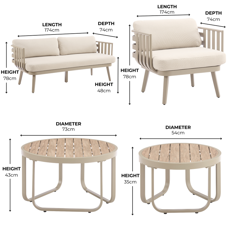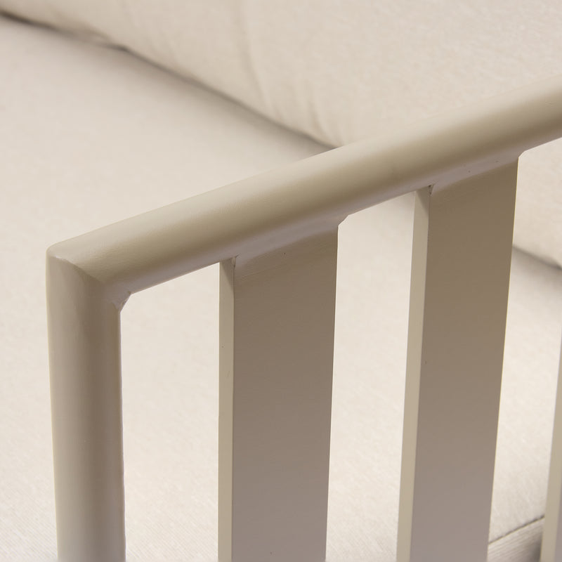 For added comfort, the set features thick, plush beige cushions that contrast beautifully with the sleek beige aluminium frame. The cushions come with removable covers that can be easily unzipped and machine washed, making maintenance effortless and ensuring your outdoor seating always looks fresh and clean.