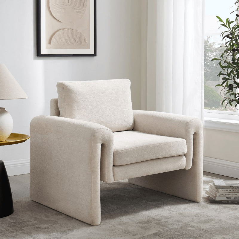 Elevate your interior with this modern accent chair, wrapped in soft, cream chenille fabric that adds warmth and texture to any space. Designed with both style and comfort in mind, it features plush, generously padded seat and back cushions that invite relaxation.