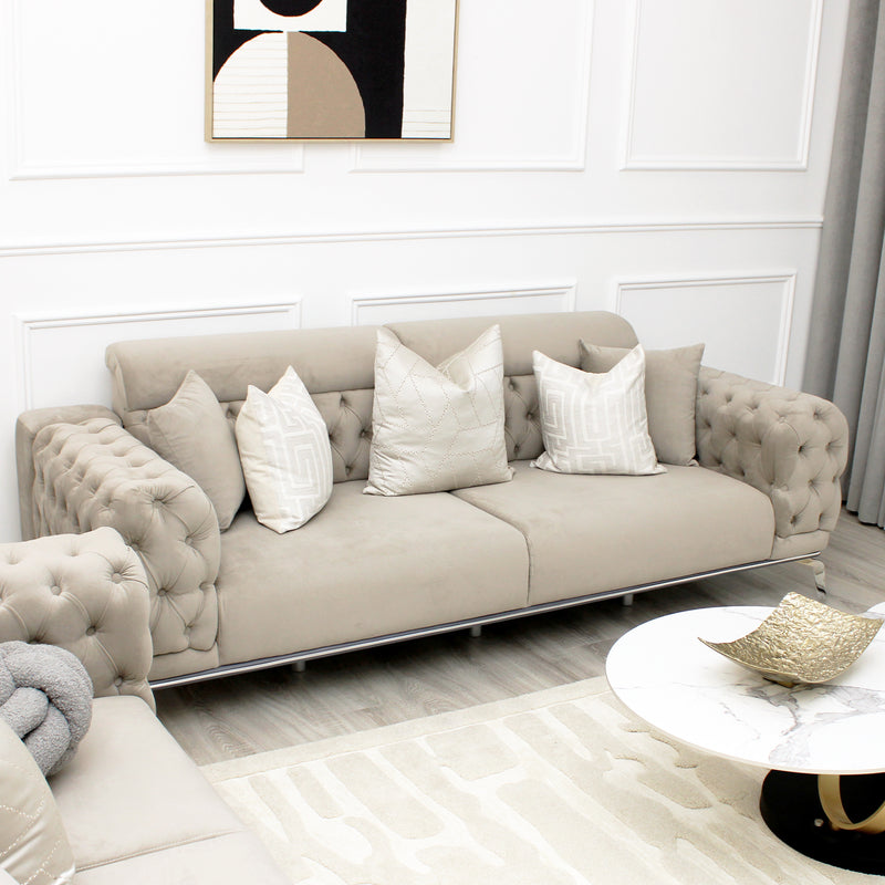 The Yasmin, buttoned velvet sofa with silver legs is the ultimate luxury in sitting room chic. With button detailing, elevated using modern and sleek lines this gorgeous sofa offers a stylish and comfortable place to relax. Built to last, this sofa sits on a hardwood base and finished with a chrome frame. The plush light grey coloured upholstery covers the Yasmin beautifully. For optimum comfort, firm foam creates a luxurious seating experience. This structured sofa features a rotating back rest allowing this to become an extra large lounger for a cinema room feel. Two matching cushions upholstered in the same plush velvet compliment this luxe sofa.